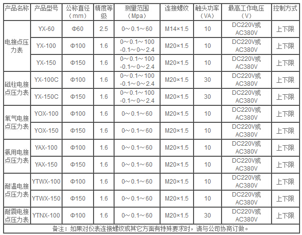 ? ? ? ? ?YX-60/100/150電接點壓力表適用于測量對銅合金無腐蝕、無爆炸危險、非結(jié)晶的各種液體、氣體等介質(zhì)的壓力。儀表經(jīng)與相應(yīng)的電氣器件配套使用,可達到對被測壓力系統(tǒng)實現(xiàn)預(yù)先設(shè)定的最大或最小壓力值的雙位自動控制和發(fā)信(報警)的目的。